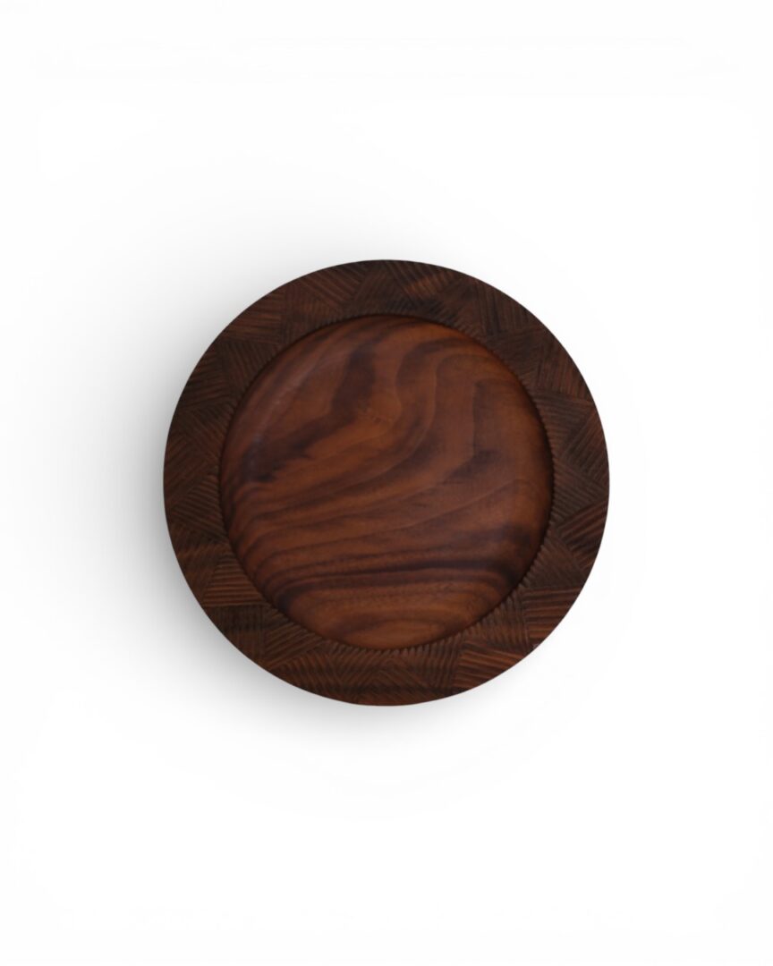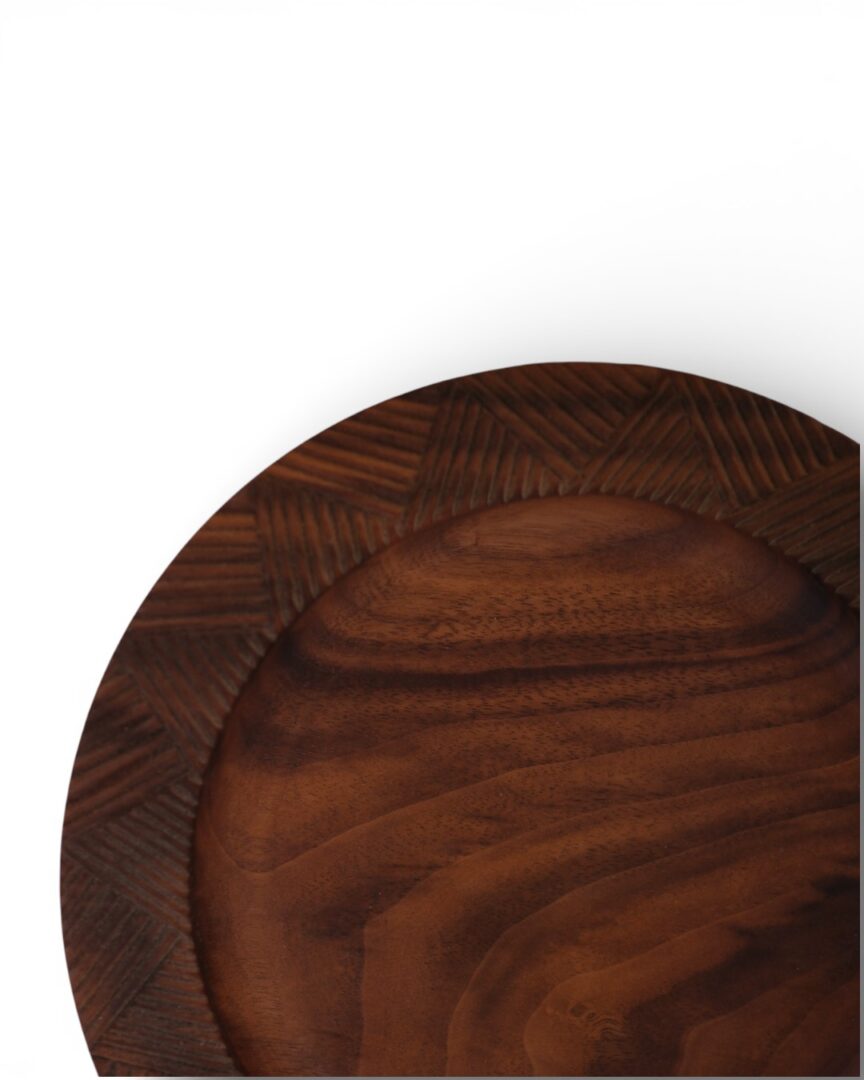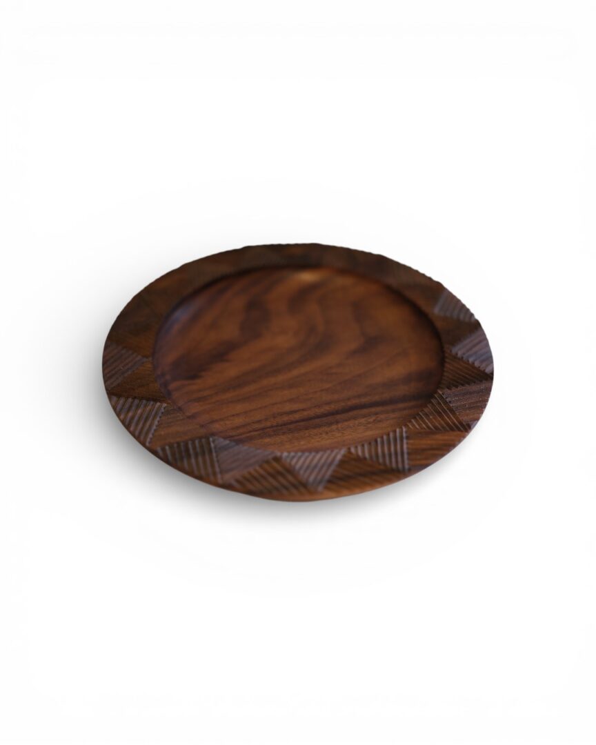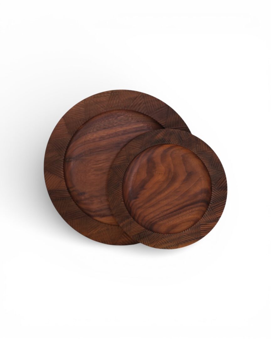 A set of two plates handcrafted from walnut wood, featuring hand-carved detailing along the rim that highlights the natural grain and warmth of the material. Designed for both serving and display.