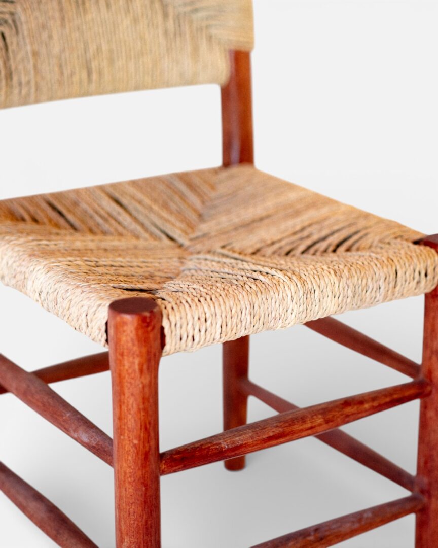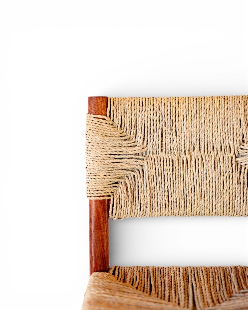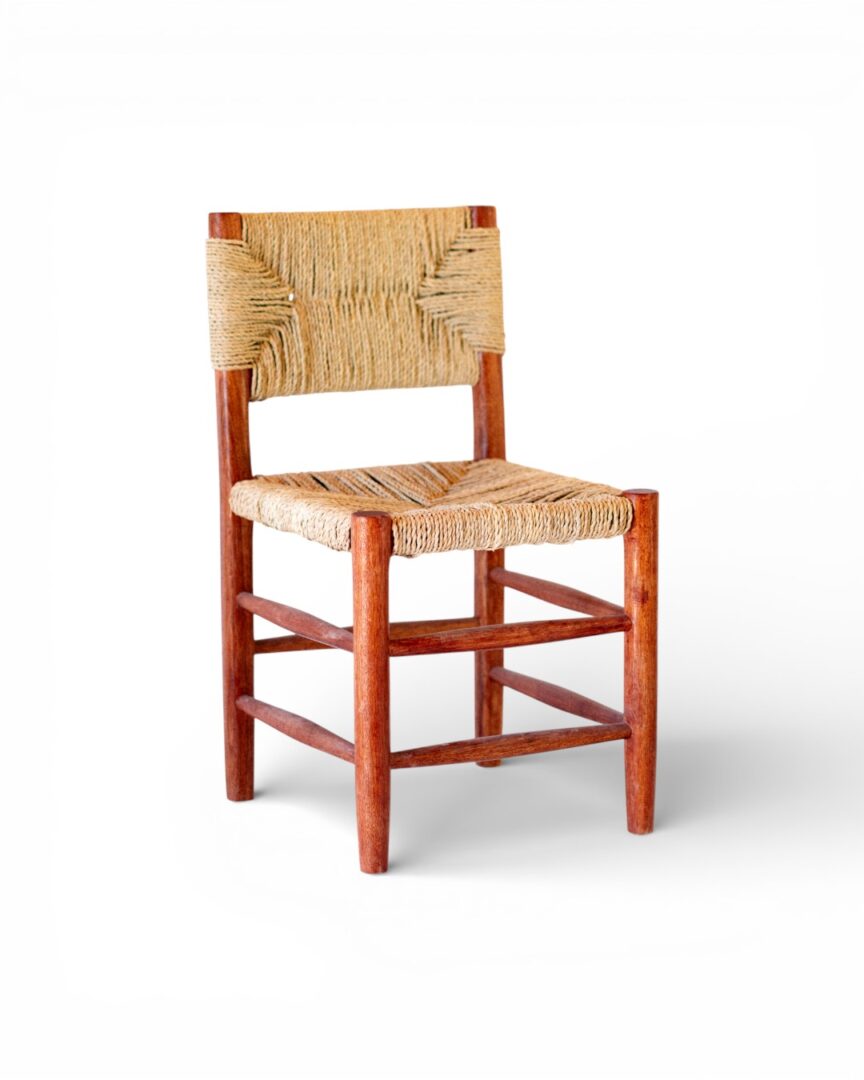 A sturdy wooden dining chair featuring a natural palm leaf woven backrest and seat, combining rustic charm with comfortable seating.