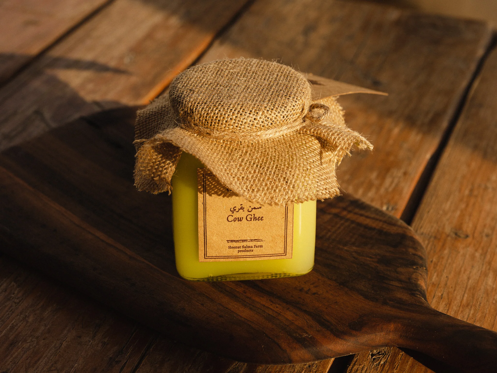 Our cow ghee is prepared by slowly clarifying butter made from fresh cow milk at Heenat Salma Farm. It has a smooth texture, rich flavour, and high smoke point, making it ideal for cooking, sautéing, and baking. Naturally free of lactose and packed with healthy fats, this traditional ghee supports digestion and provides clean, lasting energy.