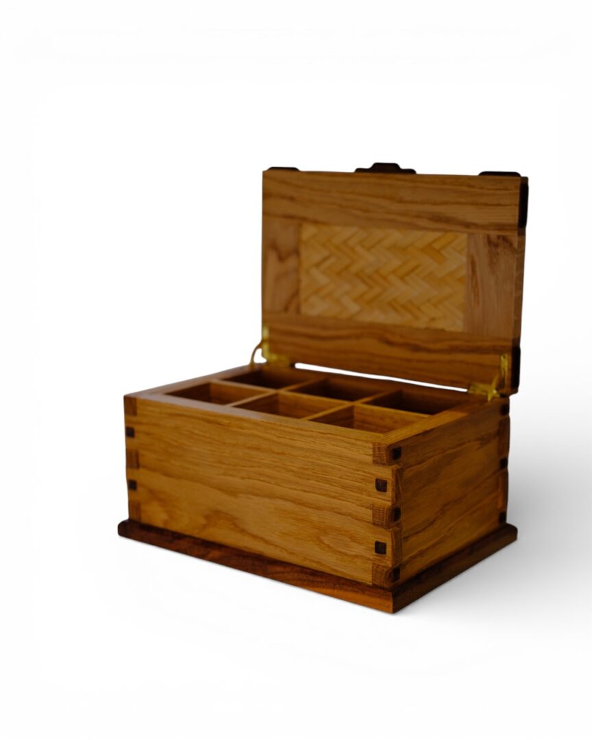 A handcrafted wooden jewelry box featuring a delicately divided interior tray for organizing precious pieces. The fine craftsmanship and natural wood finish highlight its timeless elegance, making it both a functional accessory and a beautiful keepsake.