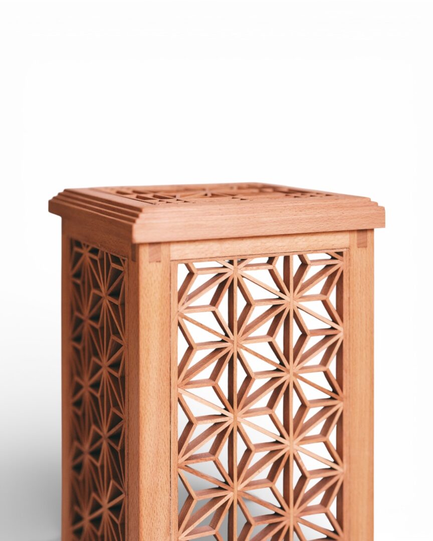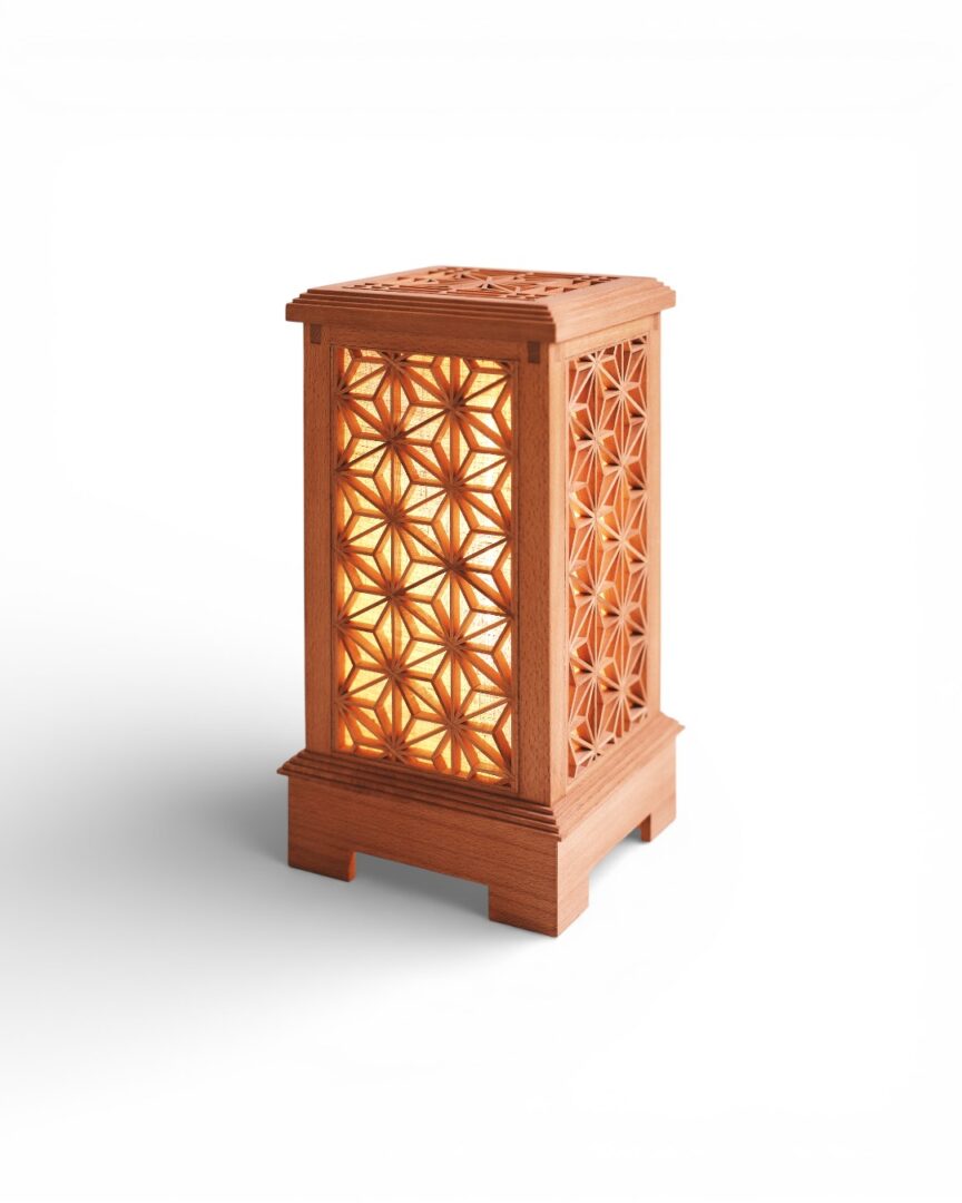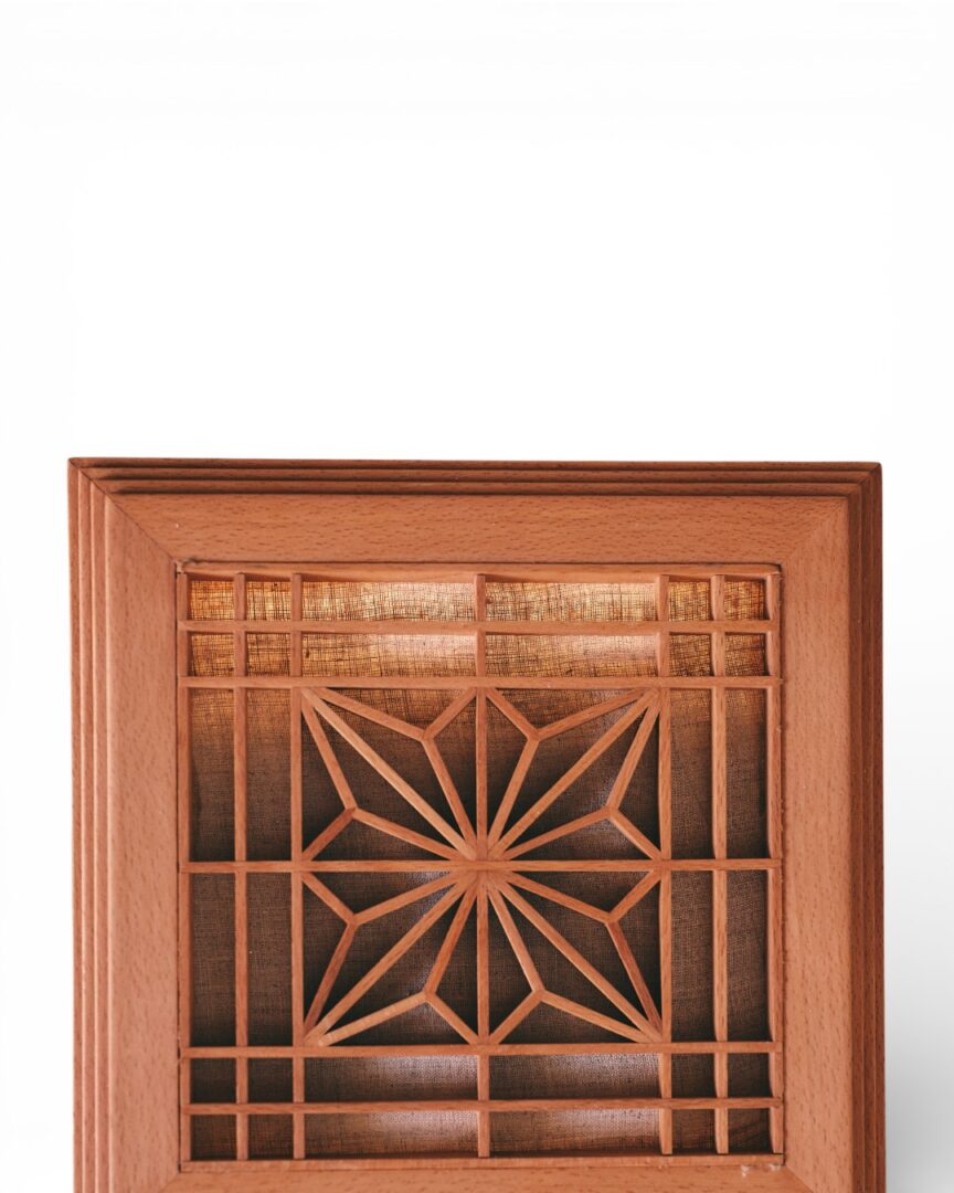 A delicate table lantern, its frame crafted with a geometric square lattice inspired by Japanese Kumiko patterns, casts a warm, patterned glow. Light dances through the grid, creating a subtle interplay of shadows and illumination, evoking a sense of quiet elegance and timeless craftsmanship.