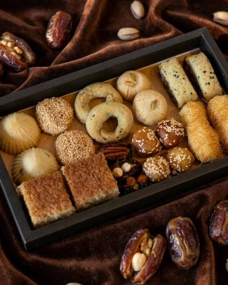 Maamoul | Barazek | Ghraybeh | Date rolls | Semolina cake | Kunafa finger rolls | Dates filled with nuts | Sesame honey bites | Palestinian ka‘ak