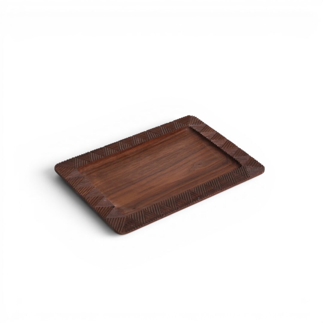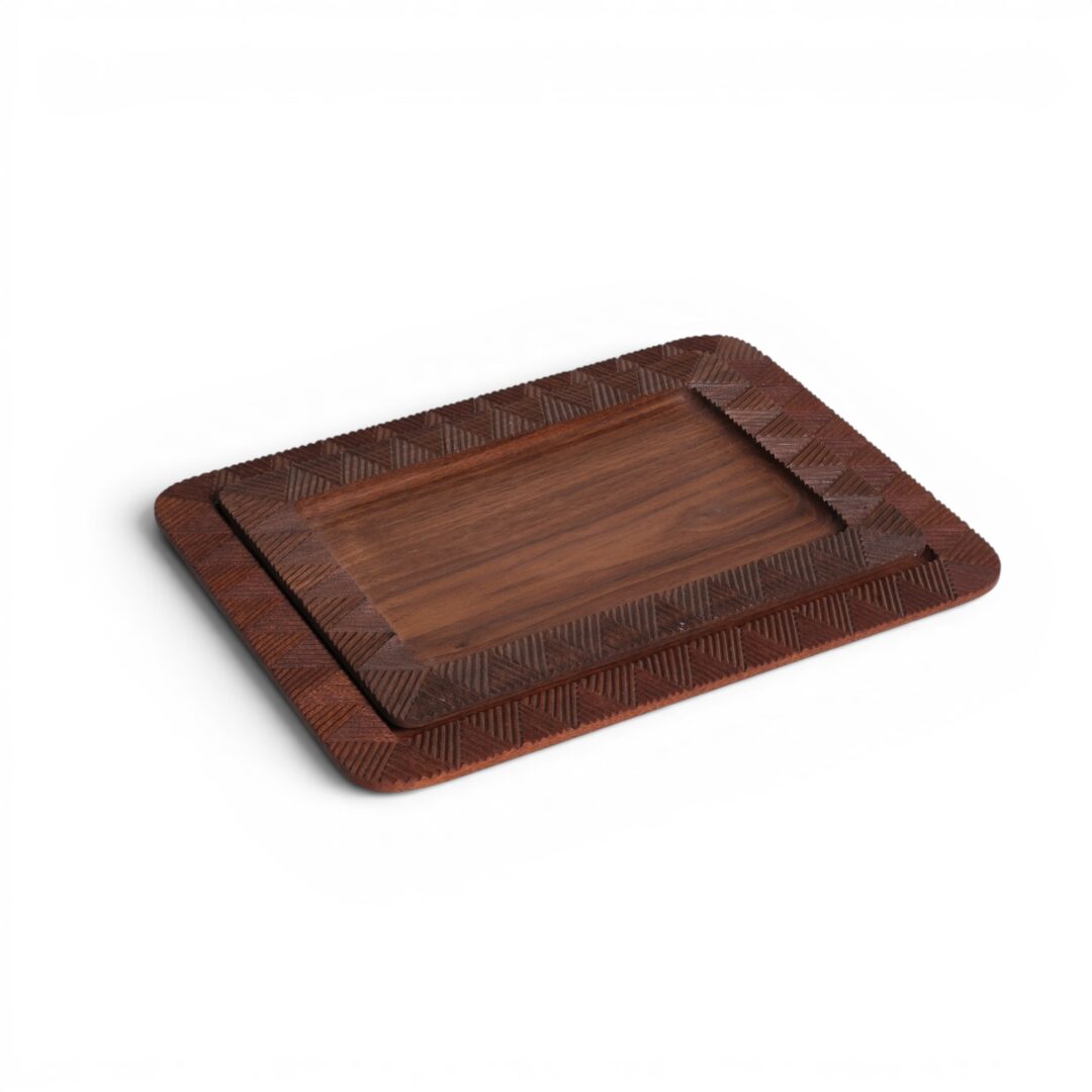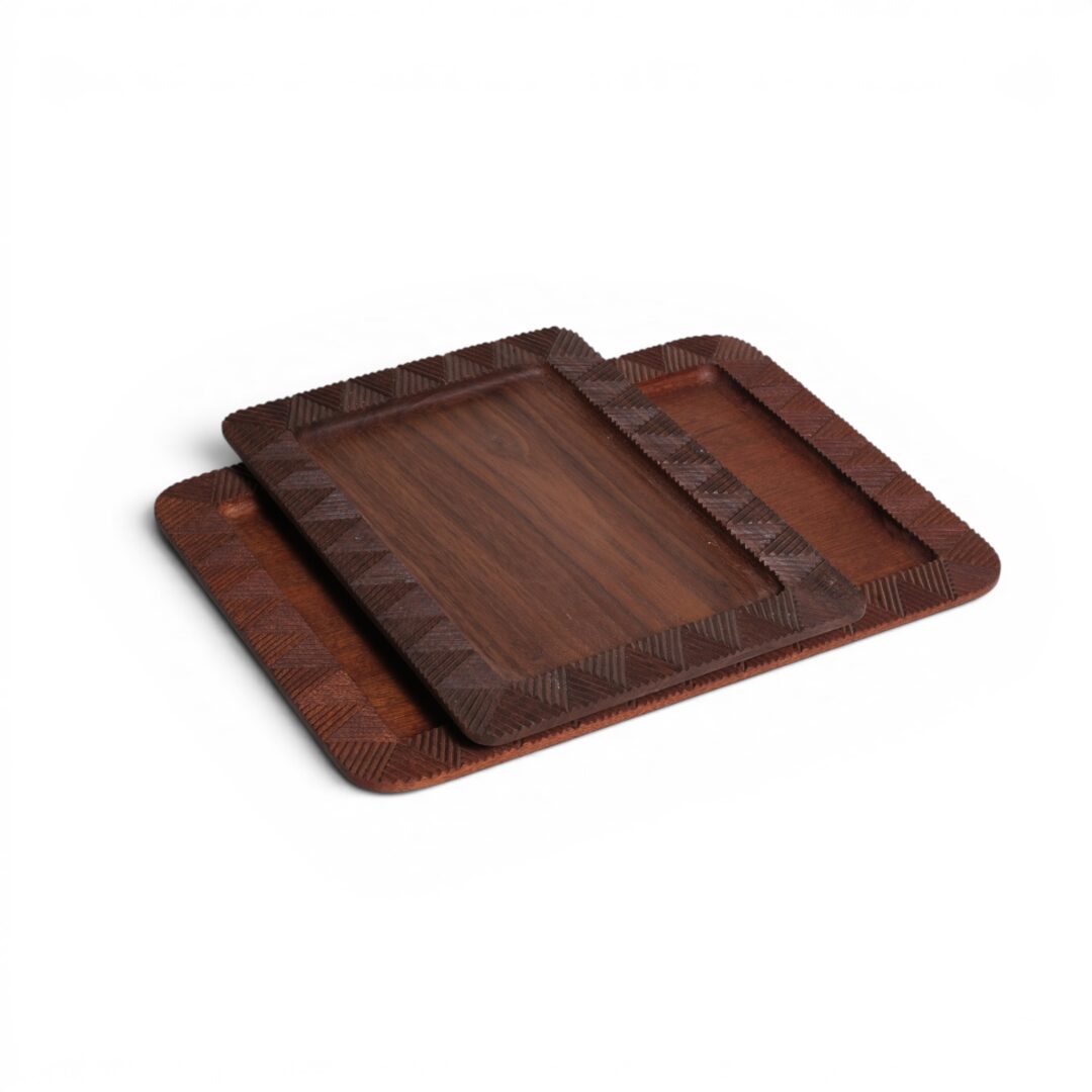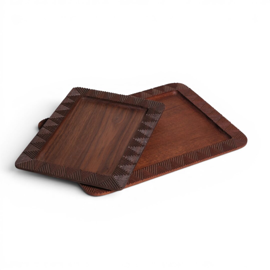 This set of two trays is crafted from solid walnut wood, with hand-carved geometric edges that add depth and character. Designed for versatile use, they bring a refined, timeless touch to serving and display.