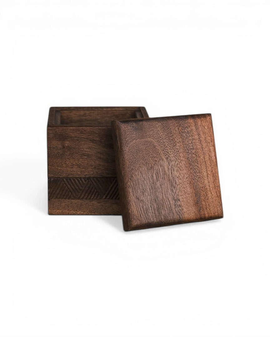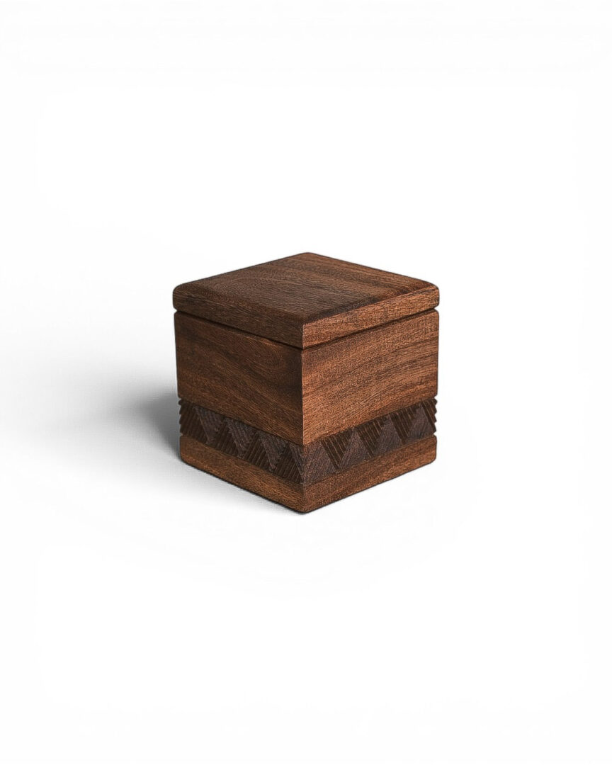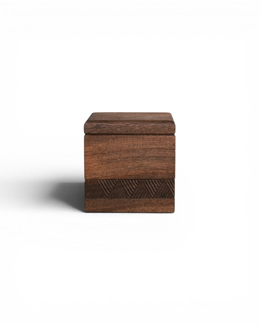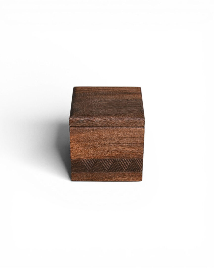 This box is crafted from solid walnut wood, with a smooth finish that highlights its natural grain. A hand-carved geometric band adds subtle texture, making it a timeless piece for storing small keepsakes or jewelry.